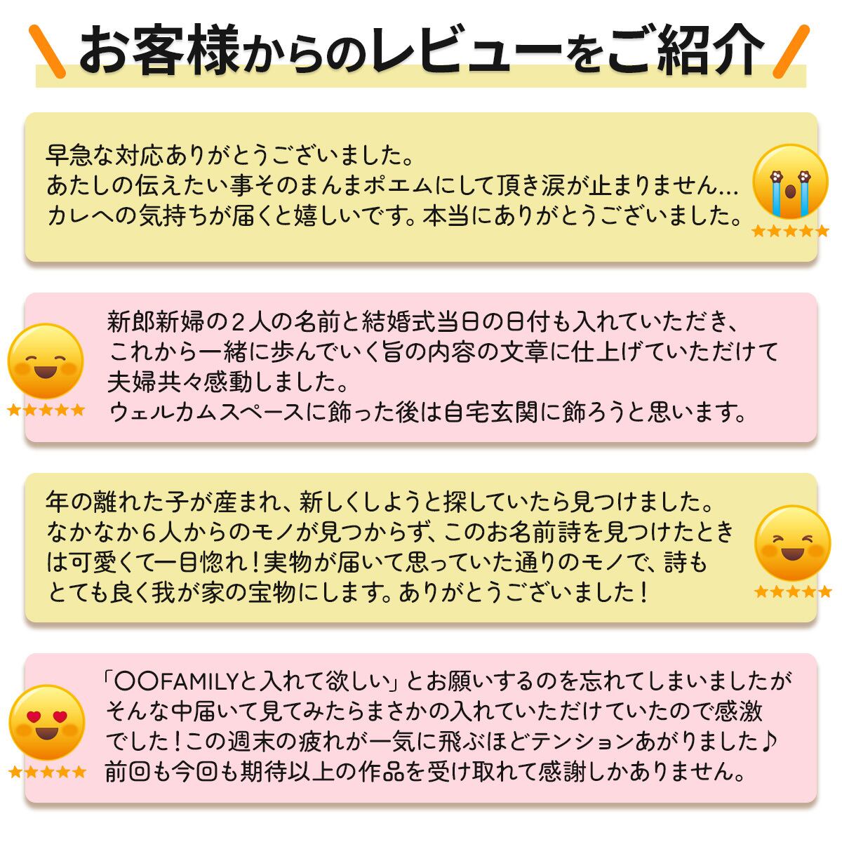お客様の想いお聞きし、その想いに寄り添いながら私なりにメッセージを汲み取り、お客様に合った言葉を選び綴らせていただきます。